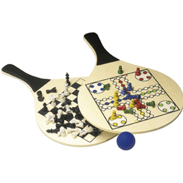 Set de 2 raquettes de plage en bois avec balle, jeu d'échec et petits chevaux dans une housse en nylon.