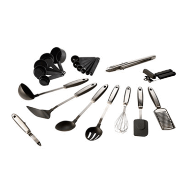 Set de 21 ustensiles de cuisine, 1 louche, 1 cuillère à service, 1 cuillère à égoutter, 1 pelle, 1 spatule, 1 fouet, 1 râpe à fromage, 1 pince, 1 économe, 1 ouvre-boite, 6 cuillères à doser (15 ml, 7,5 ml, 5 ml, 2,5 ml, 1,25 ml, 0,625 ml), 5 pelles à doser (240 ml, 120 ml, 80 ml, 60 ml, 30 ml)