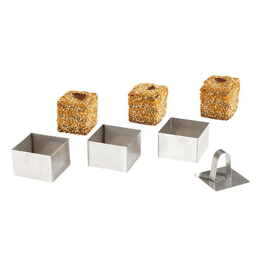 Set de 3 carrés de présentation en acier inoxydable pour la réalisation de mousses, purées, tartares, entremets, timbales de riz, desserts, dimensions 6 x 6 cm, avec poussoir pour tasser les préparations et faciliter le démoulage, s?utilise également comme emporte pièces pour découper biscuits, génoises, toasts
