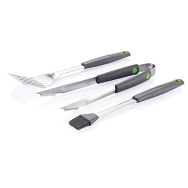 Set moderne pour barbecue avec spatule, pince et brosse en silicone, le tout en en acier inoxydable avec poignées en TPR et anneaux verts.