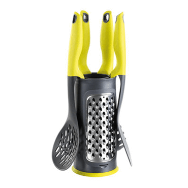 Set de 5 ustensiles de cuisine plastique sur présentoir, 1 cuillère à spaghettis pour servir, 1 spatule trouée pour retourner ou servir viandes et poissons, 1 cuillère passoire pour égoutter, 1 fouet pour mélanger, 1 râpe intégrée sur présentoir