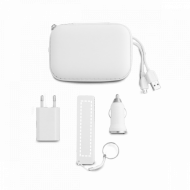 Set de batterie et chargeur USB. ABS. Inclus batterie portable avec batterie au lithium et câble USB/micro-USB. Capacité: 2'000 mAh. Durée de vie = 500 cycles. Chargeurs électrique et de voiture avec sortie 5V/1A inclus. Livré dans étui en EVA. Housse: 112 x 80 x 45 mm