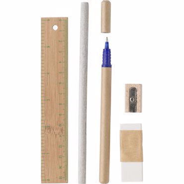 Set de bureau comprenant une règle en bambou, un taille-crayon en bois, une gomme, un crayon et stylo bille en plastique, mine bleue.