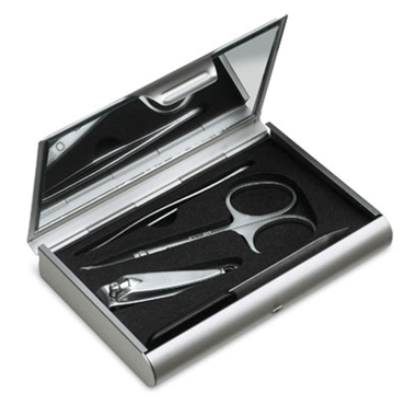 Set de manucure REFLECTS CANTON-aluminium/acier, argenté, Boîtier métallique, lime à ongles, coupe-ongles, Ciseaux à ongles, pince à épiler, miroir, emballage REFLECTS Dim Packaging : 22x78x113 mm