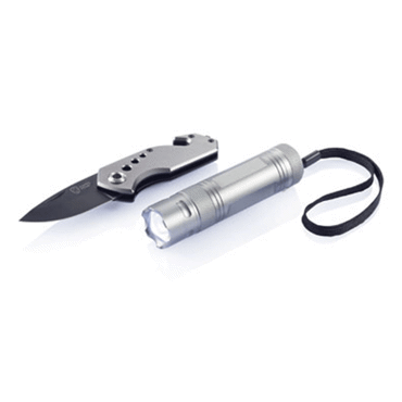 Set contenant une puissante torche LED 0,5W avec ouvre-bouteille intégré et un couteau multifonction avec marteau de secours et coupe-ceinture. Les 2 outils peuvent être rangés dans une pochette Swiss Peak et gardés dans la voiture pour servir en cas d?urgence. Modèle déposé®
