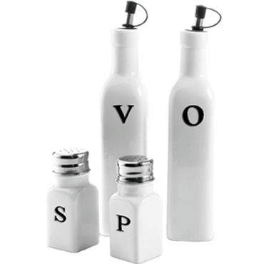 Set de table comprenant vinaigrier, huilier, poivrier et salière en céramique dans une boîte cadeau.