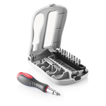 Coffret gris avec ouverture automatique contenant 10 embouts: PH0, PH1, PH2, SL3, SL4, SL5, SL6, PZ0, PZ1, PZ2, et 1 tournevis avec un manche rouge et noir. Livré dans une boîte blanche. Modèle déposé®