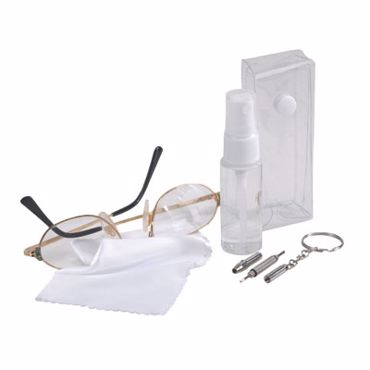 Set entretien lunettes. Set de nettoyage pour lunettes ""View"" : vaporisateur avec liquide nettoyant (env. 20ml), chiffon, mini tournevis avec porte clés, dans un étui PVC et fermeture bouton pression.