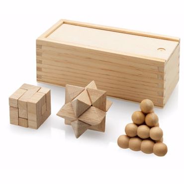 . Casse-tête chinois en bois 3 pièces. Sous écrin bois. Marquage uniquement sur l'écrin.