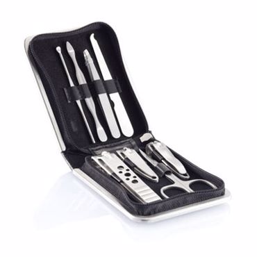 Set manucure de luxe. Set manucure de haute qualité, en acier inoxydable. Grande pince à ongles, petite pince à ongles, ciseaux, lime à ongles, double cure-ongles, pochette en PU avec bord en acier inoxydable.