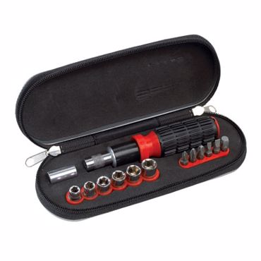 Set outillage simple, 14 pièces: comprend un tournevis avec manche gommé et embouts de différentes tailles dans une boîte en métal avec fermeture éclair. emballage cadeau .