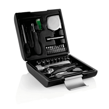 Set de 27 outils en carbone inoxydable, emballés dans un boîtier noir en PE avec fermoir en aluminium anodisé. Modèle déposé®