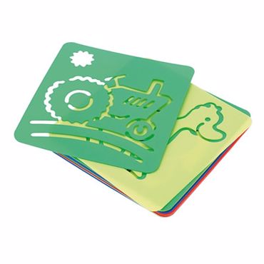 Set pochoirs à dessin Set de 12 pochoirs. Coloris assortis : bleu, rouge, vert et jaune. Un cheval, un agriculteur fourche+ fumier, un tracteur, une vache, un épouvantail, un chat, un chien, une poule, un canard, une ferme (type états unis), un mouton, un cochon Pochoir et boîte en matière recyclable