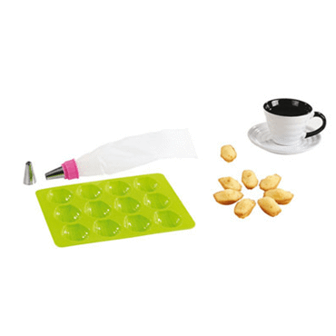 Set pour réaliser des mini madeleines sucrées et salées pour les goûters, desserts, apéritifs, composé d?un moule silicone 12 empreintes, une poche à douilles avec 2 embouts
