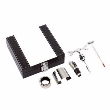 Set de vin "discovery" : avec thermomètre, bec verseur, anti-goutte, tire-bouchon dans une boite noire et blanche