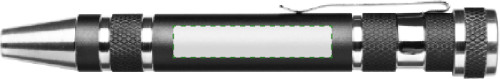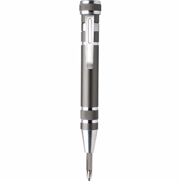 Set composé d'un tournevis (4 embouts plats et 4 cruciformes) et d'un porte-clés en aluminium muni de 3 LEDS, piles incluses.