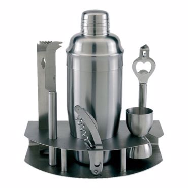 Set à cocktail en métal, avec shaker, pince à glaçons, couteau, couteau de sommelier, double doseur (25 et 40 ml), tire-bouchon et décapsuleur sur un socle