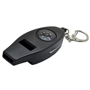 Sifflet en plastique noir, 4 fonctions : sifflet, loupe, boussole, thermomètre. Avec anneau mousqueton.