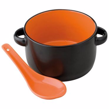 Soupière individuelle. Contenant pour le potage en porcelaine noire (0,3 L) avec cuillère et deux anses latérales. Disponible en 4 coloris intérieurs avec cuillère assortie. Marquage laser sur le contenant.