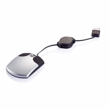 Souris extra plate pour ordinateur. Boîtier argenté avec boutons caoutchouc noirs, roulette de défilement transparente, port USB. Technologie de précision optique.