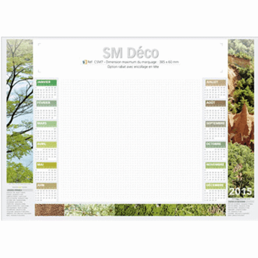 SOUS MAINS / CALENDRIER SM DECO Reliure : encollage en pied Support : 25 feuilles papier offset 80 g - carton de fond 350 g Grille : annuelle - n° semaine - quadrillage 5x5 Disponible en neutre ou QUADRI Quantité mini AVEC et SANS REPIQUAGE : 50 ex Pour les Sous main : plus value pour RABAT coloris noir supplément de prix