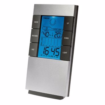 Station météo hygromètre, bluelight. Station météo, prévisions météo, pictos météo animés, thermomètre, hygromètre, mémoire des min./max. pour la température et l'hygrométrie, indication des températures des 12 dernières heures, calendrier perpétuel avec jour de la semaine, alarme, mode 12/24 heures, rétro-éclairage bleu, pied amovible, fixation murale ou sur socle.