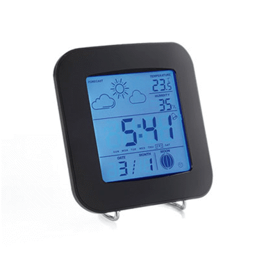 Station météo, prévisions météo par pictos, indication des phases lunaires, thermomètre, hygromètre, mémorisation des min. et max., horloge, alarme, calendrier perpétuel, rétroéclairage bleu