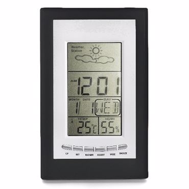 Station météo en plastique avec température intérieure, prévision météorologique, hygromètre, calendrier, pendulette et alarme, piles incluses.
