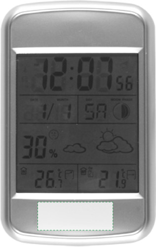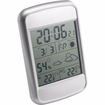 Station météo sans fil en plastique avec température intérieure/extérieure, prévision météorologique, phase lunaire, hygromètre, calendrier, pendulette et alarme, piles incluses. 4 pile(s) réf. UM4