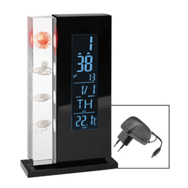 Station météo REFLECTS LIBOURNE-verre/plastique, noir, Mode 12/24 heures, Adaptateur inclusive, piles incluses, CE, Date, éclairage de l'écran, Couleur diode bleu, Couleur diode verde, Couleur diode rouge, Couleur diode blanche, Horloge, Fonction réveil et alarme répétitive, tendance météo, Indication jour, emballage REFLECTS