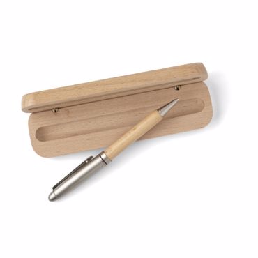 Stylo bille en bambou et métal dans un écrin en bambou, mine bleue.