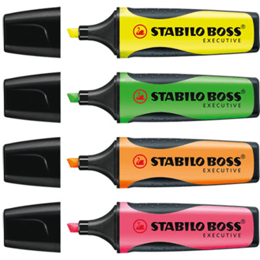 LE MEILLEUR BOSS DE TOUS LES TEMPS. Surligneur de forme classique avec zone de préhension souple et ergonomique. Encre exclusive et brevetée anti-bavures, à base de pigments spéciaux. Peut rester longtemps ouvert.