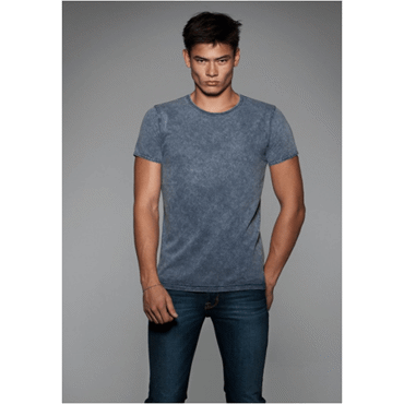 100% coton pré-rétréci ring-spun. T-shirt manches courtes en Single Jersey. Teinture à l'indigo avec effet denim. Col rond ras-du-cou en côte 1x1 avec bande de propreté d'épaule à épaule, finition en double point de chaînette pour plus d'élasticité. Manches montées avec finition ourlet surpiqûre simple. Coutures invisibles sur le bord inférieur. Grammage du produit : 185 gr/m²