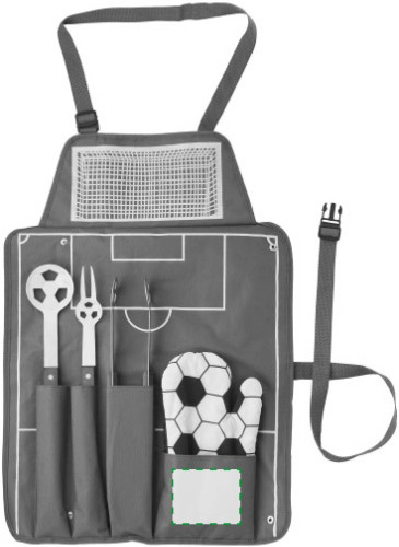 Tablier barbecue 'football'en polyester 600D comprenant une spatule,une fourchette à viande et une pince.