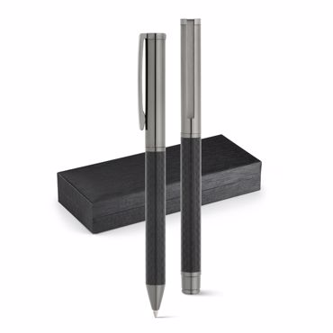 Set stylo roller et stylo à bille. Métal et fibre de carbone. Roller avec écriture noire et stylo encre bleue. Livré dans coffret cadeau rembourré. ø10 x 135 mm | Coffret: 185 x 75 x 31 mm