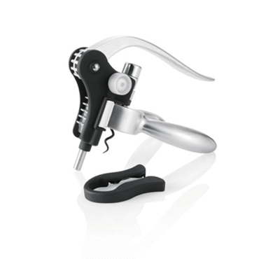 Tire-bouchon à système de levier, corps aluminium, spirale acier enduite de Teflon, coupe-capsule et plaque métal résumant les meilleurs vins depuis 1990.