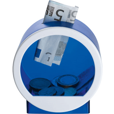 Tirelire en plastique maté a une ouverture en bas et un côté transparent pour voir ce qui se trouve déjà dans la tirelire. Votre publicité se fait sur le bord blanc.