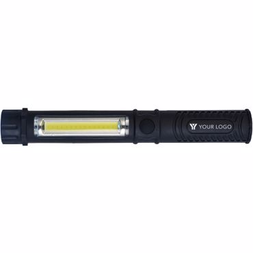 Torche en ABS munie de LEDS COB et d'une LED blanche, équipée d'un aimant et d'une pince, piles incluses (Marquage en noir, blanc ou argenté).