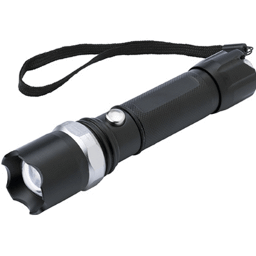 Torche rechargeable en aluminium munie d'une LED blanche avec les fonctions fixes, clignotement et zoom, prise secteur incluse.