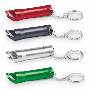 Torche en métal avec 3 LED, décapsulateur et porte-clés. 3 piles LR44 incluses. Sachet individuel