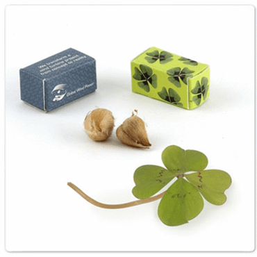 Mini boîte trèfle Présentation : Une toute petite boîte imprimée contenant 2 bulbes de trèfle à 4 feuilles. La chance à portée de main. Composition : 2 bulbes de trèfle à 4 feuilles. Longueur : 30 mm. Largeur : 15 mm. Poids : Environ 15 gr. Personnalisation : La boîte est imprimée en quadrichromie à votre communication, sur du papier issu de forêts gérées durablement avec des encres végétales et protégé par un vernis à l'eau sans solvant. Quantite minimum : 500e. Prix indiqué hors frais techniques et frais de transport