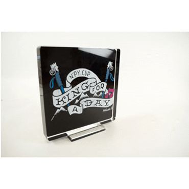 trophée en verre acrylique usiné numérique (fronton en épaisseur 30 mm + socle amovible) + impression quadri en miroir - de l?unité à la série- devis sur demande.