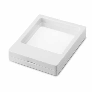 Petit cadre universel en plastique avec feuille, utilisation comme un emballage cadeau possible. Dimension intérieure du cadre 75 x 75 mm. 90 x 111 x 20 mm