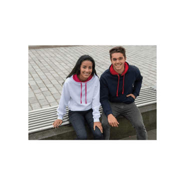 80% coton / 20% polyester. Sweat mixte. Capuche doublée contrastée à l'intérieur. Cordons contrastés. Poche kangourou avec ouverture discrète à l'intérieur pour passer des cordons d'écouteurs et attache discrète à l'intérieur du col. Bord côte aux poignets et à la taille. Finition double aiguille. Certifié WRAP. Grammage du produit : 280 gr/m²