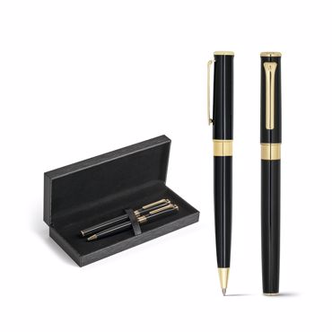 Set stylo roller et stylo à bille. Métal. Eléments plaqués or 18 carat. Livré dans coffret matelassé. Dimension : ø12 x 136 mm | Coffret: 185 x 75 x 31 mm