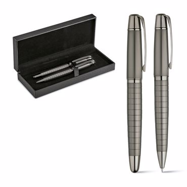 Set stylo roller et stylo à bille. Métal. Roller avec écriture noire et stylo encre bleue. Livré dans coffret matelassé. ø13 x 135 mm | Coffret: 185 x 75 x 31 mm
